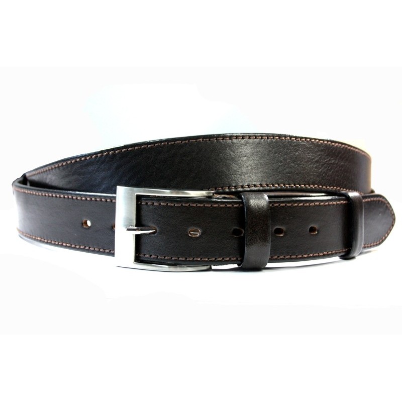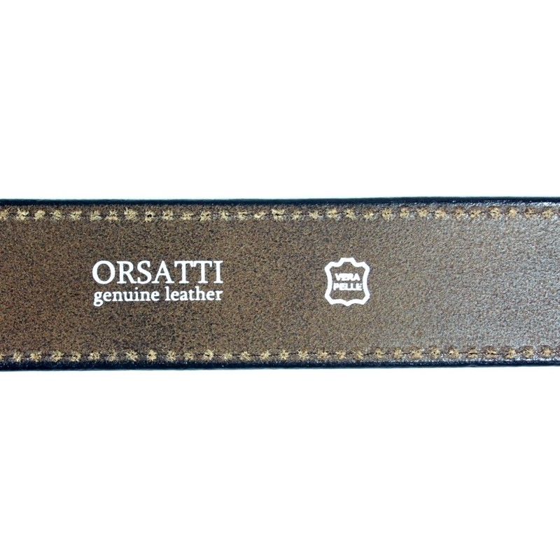 Brązowy pasek do spodni typu dżinsy, sztruksy itd marki Orsatti z ekskluzywną klasyczną, metalową klamrą oraz z przeszyciem skóry. Wykonany z wysokiej jakości skóry naturalnej.  Zapakowany w eleganckie pudełko oraz torebkę z logo producenta.