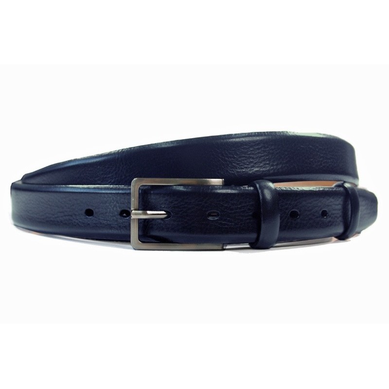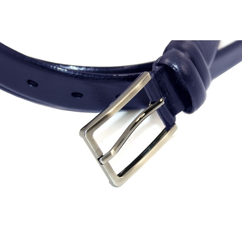 Granatowy pasek do garnituru marki Orsatti z ekskluzywną klasyczną, metalową klamrą. Wykonany z wysokiej jakości skóry naturalnej. Zapakowany w eleganckie pudełko oraz torebkę z logo producenta.